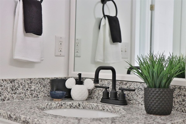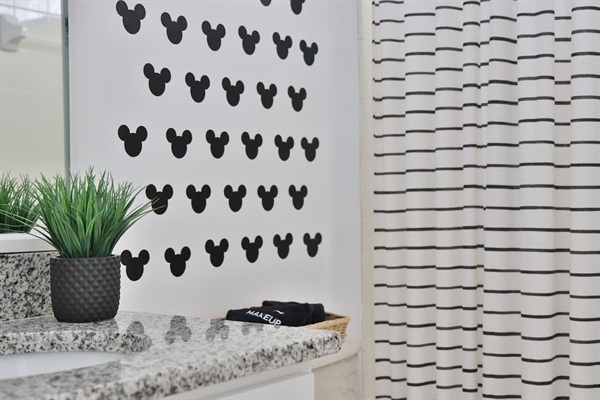 Fun Mickey Mouse themed full bathroom stocked with body wash, shampoo and conditioner