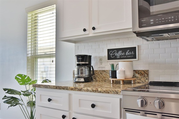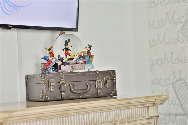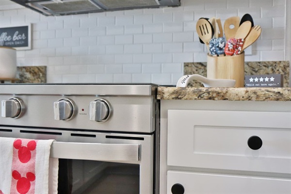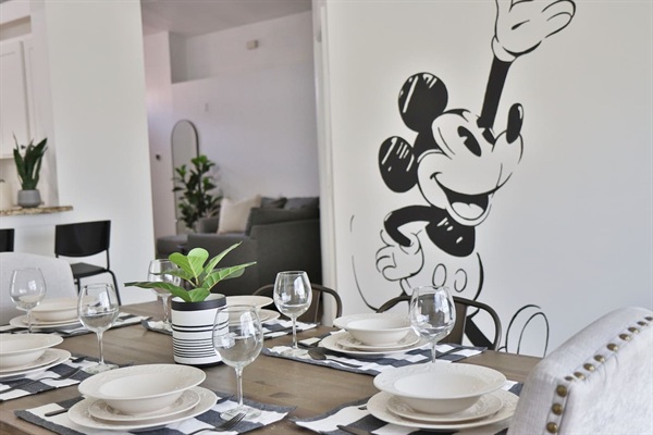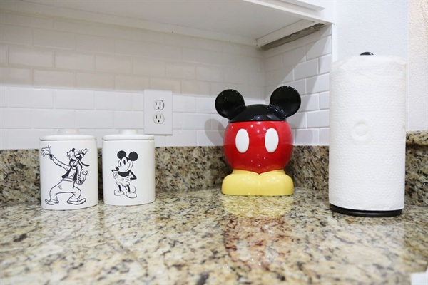 Fully stocked kitchen with dishwasher, and touches of Mickey mouse items and decor