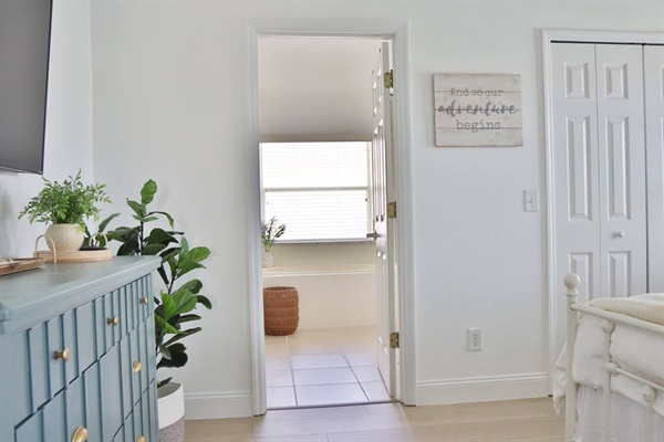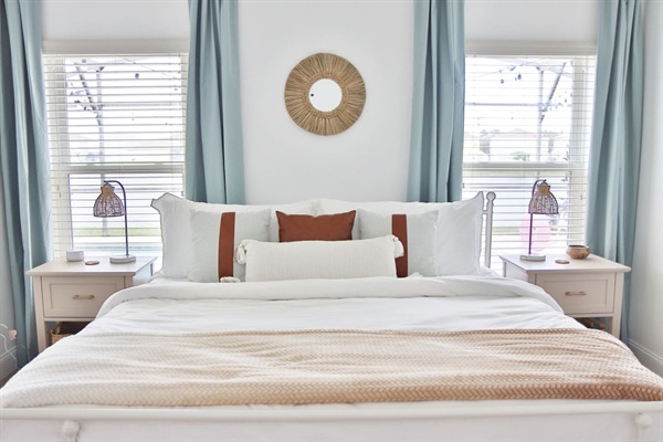 Master suite with a King sized bed and black out curtains