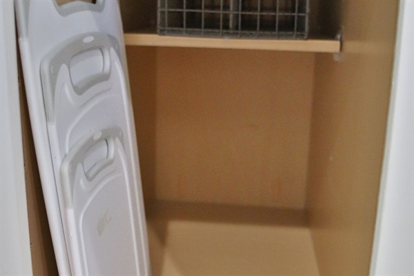 Sandwich press, skillet, blender and toaster can be found in the pantry
