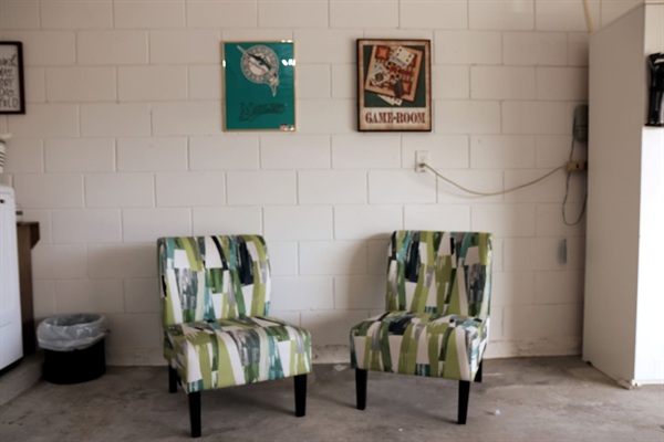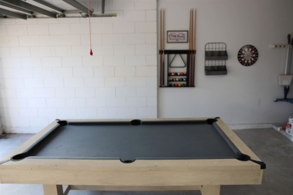 Garage game-room with pool table and kid-friendly magnet dart board (no air-conditioning in the garage).