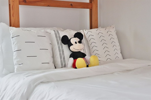 Fun Mickey Mouse themed bedroom with a Twin over Full bunk bed and black out curtains