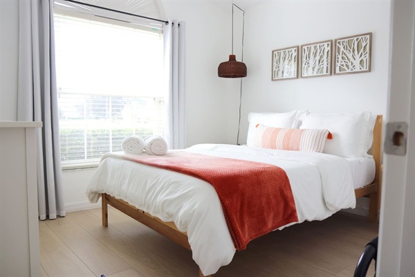 Serene bedroom with Queen sized bed and black out curtains
